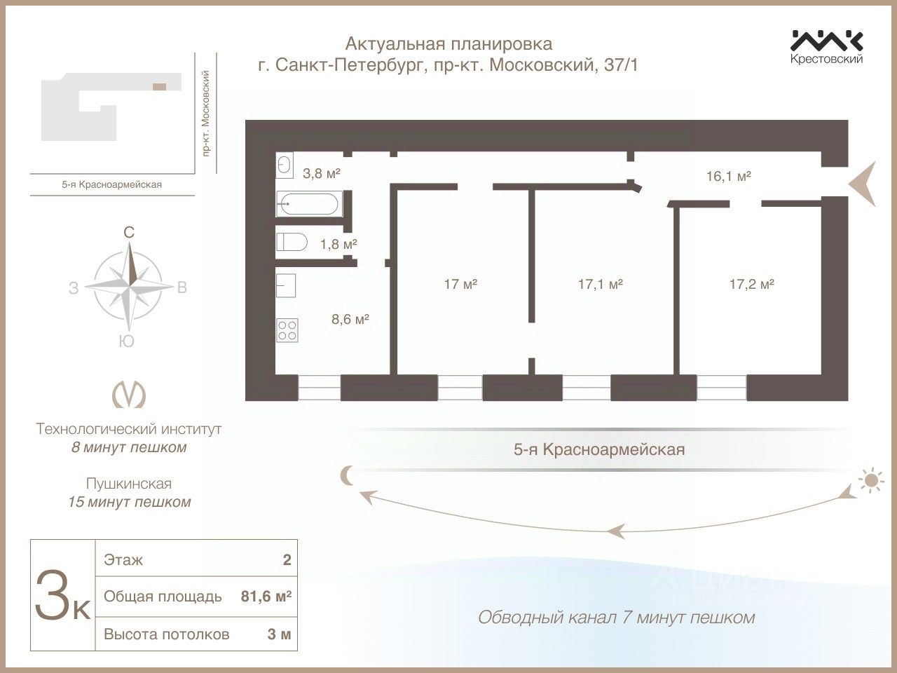На этаже всего две квартиры. Внутри — три изолированные комнаты одинаковой просторной площади, высокие потолки 3 метра и новый косметический ремонт (после него в квартире никто не жил). Окна выходят на тихую 5-ю Красноармейскую улицу, окружённую зеленью.