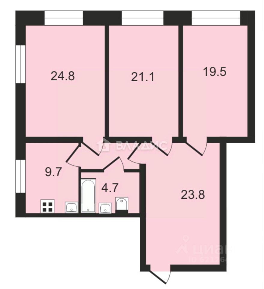 Изолированные комнаты (24,8 кв. м, 19,5 кв. м и 11 кв. м) идеально подойдут для семьи, желающей иметь личное пространство.