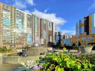 Очень красивая и ухоженная придомовая территория, разнообразные площадки для отдыха и приятных прогулок. Красивый фонтан. Инфраструктура развита: садик и школа прямо во дворе; магазины, аптеки, кафе, пункты выдачи - все есть!