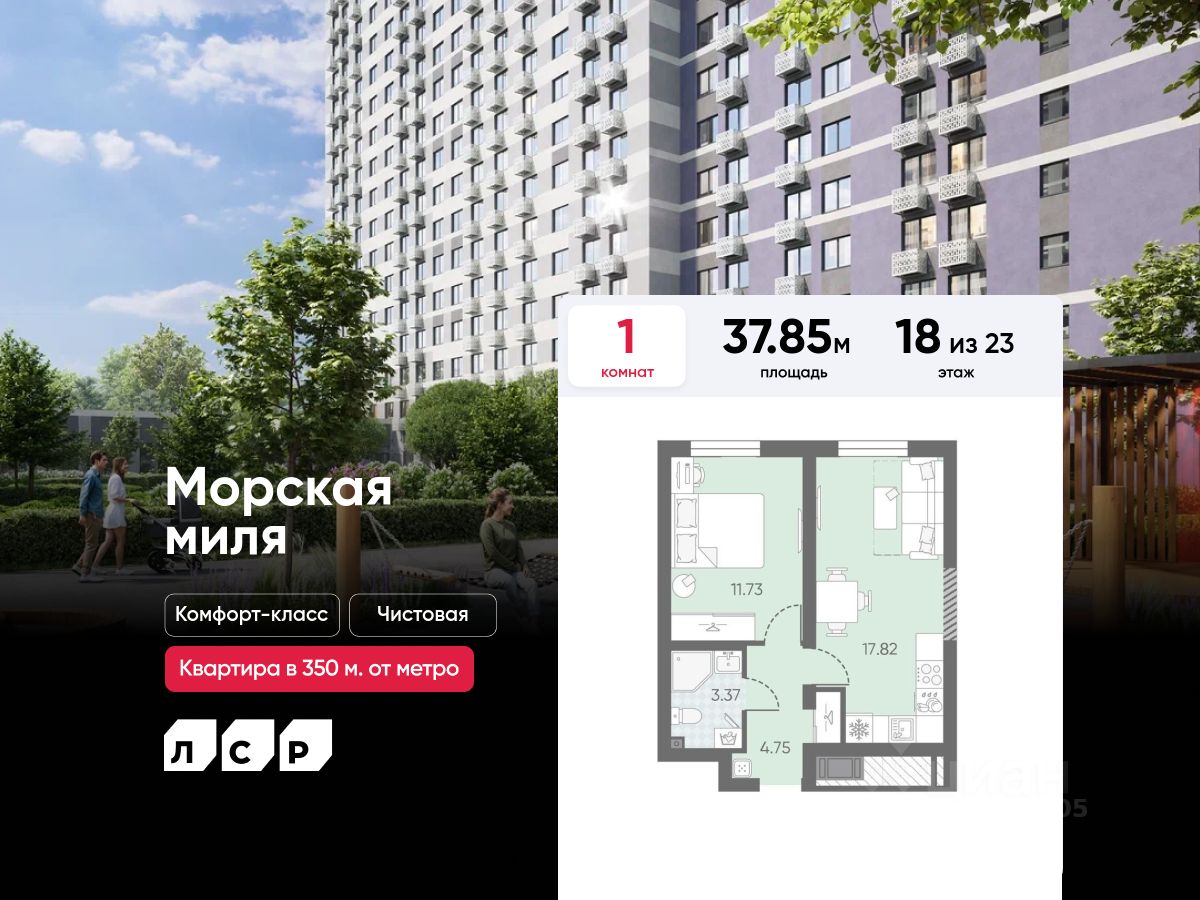 Продается 1-комнатная квартира в ЖК "Морская миля" на 18 этаже. Общая площадь составляет 37.85 кв. м. Квартира с чистовой отделкой. Жилой комплекс "Морская миля" располагается по адресу Санкт-Петербург, Красносельский.