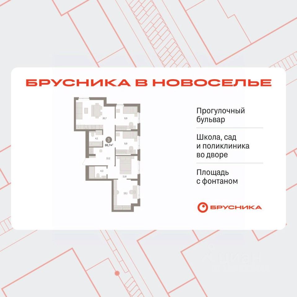 Продается 3-комн. квартира от застройщика с предчистовой отделкой в ЖК "Брусника в Новоселье" на 2 этаже. Общая площадь: 86.74 кв.м. Высота потолков 2.7 м.