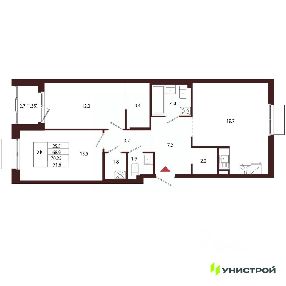 Общая площадь70,25 м²