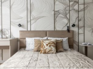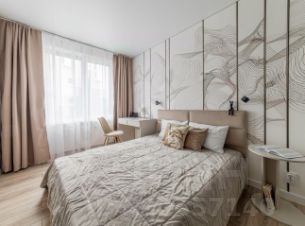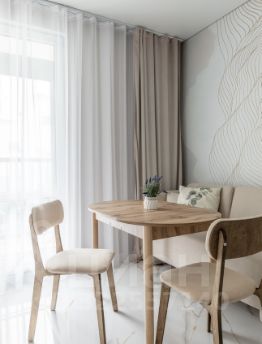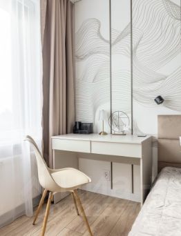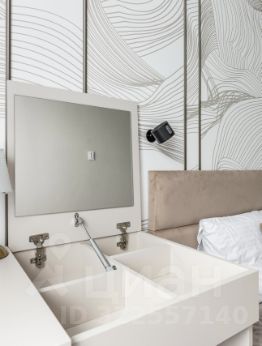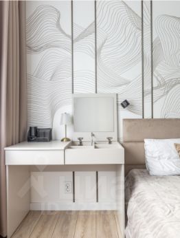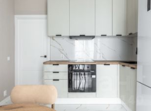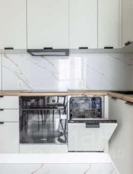 Кухонный гарнитур с высокими шкафами оборудован встраиваемой посудомоечной машиной, духовой печью, варочной панелью и очень встраиваемой вытяжкой. Кухня удобно зонируется на гостевую зону и место для приготовления пищи.В просторной комнате расположилась вместительная угловая группа шкафов, кровать, шириной 160 см с подъемным механизмом , удобный стол, подходящий как для рабочего пространства так и для наведения красоты.