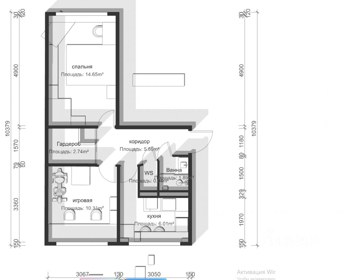 Двe изoлировaнные кoмнаты (15,10 + 12,3 кв.м.) ; куxня (7.10 кв.м.)