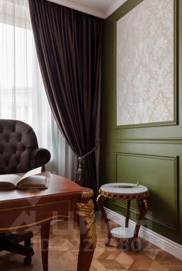 Вся мебель выполнена на заказ, европейского производства из натурального дерева. Обивка мягкой мебели и гардины - итальянский бархат.