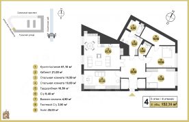 Эргономичная планировка с большим холлом, 3 изолированными жилыми комнатами (взрослой и детской спальными комнатами, кабинетом), просторной кухней-гостиной, двумя санузлами, ванной комнатой и вместительной гардеробной.