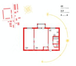 - общая площадь квартиры 42,6 кв.м., комнаты 17 и 12 кв.м., кухня 5,4 кв.м., высота потолков 2,5 м., санузел раздельный;