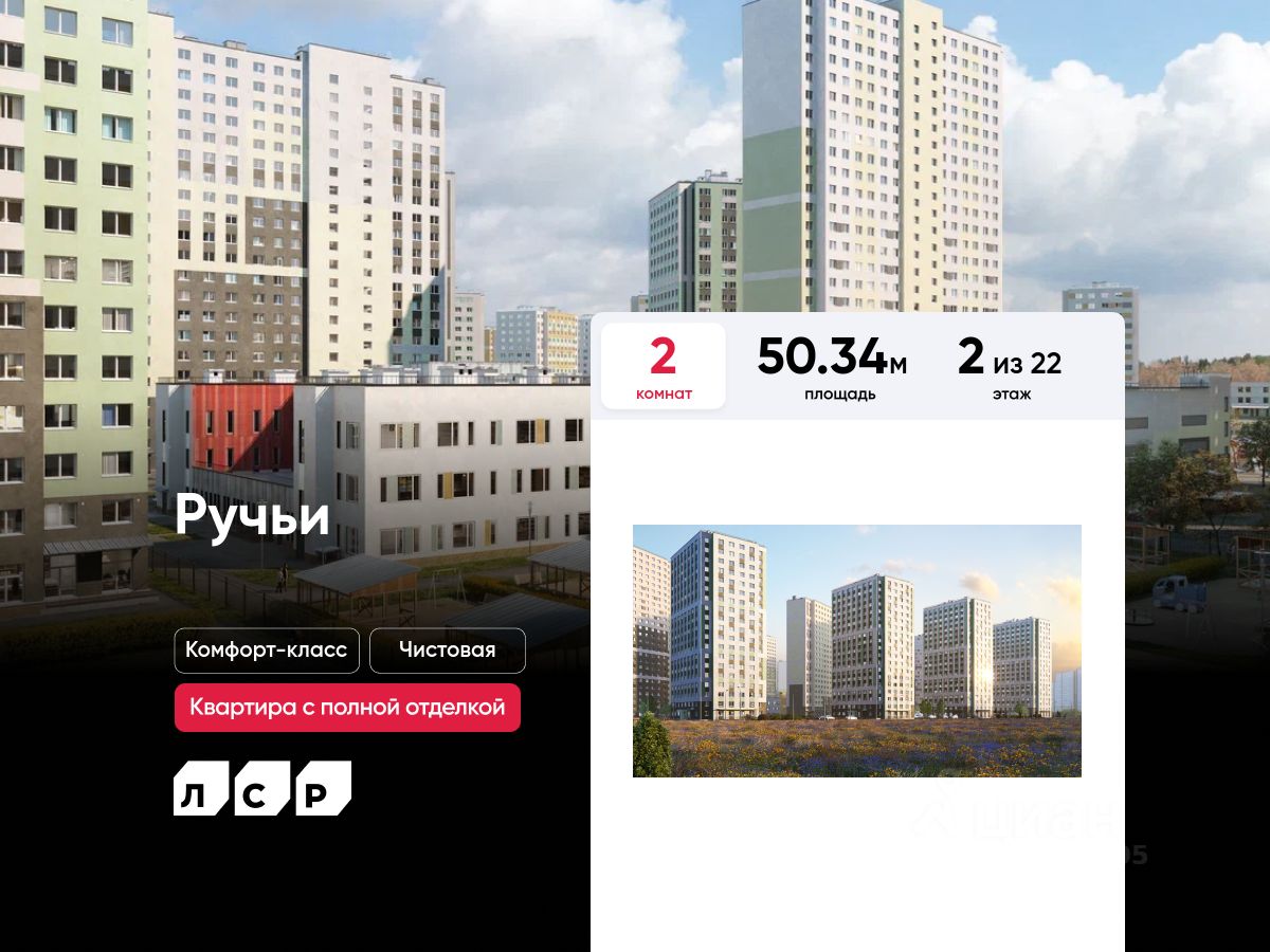 Продаётся 2-комнатная квартира в ЖК "Ручьи" на 2 этаже. Общая площадь составляет 50.34 кв. м. Квартира с чистовой отделкой. Жилой комплекс "Ручьи" располагается по адресу Санкт-Петербург, Красногвардейский.