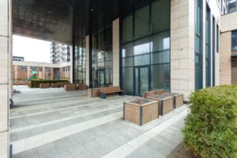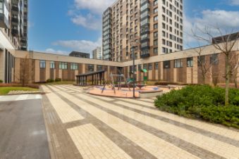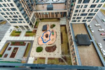 Во дворе — благоустроенная зелёная территория с декоративными растениями, газонами, искусственными насыпями. Для детей — площадки, лабиринт и зоны отдыха. Для любителей спорта — поле для футбола, баскетбола и волейбола. Двор закрыт для проезда машин.