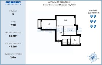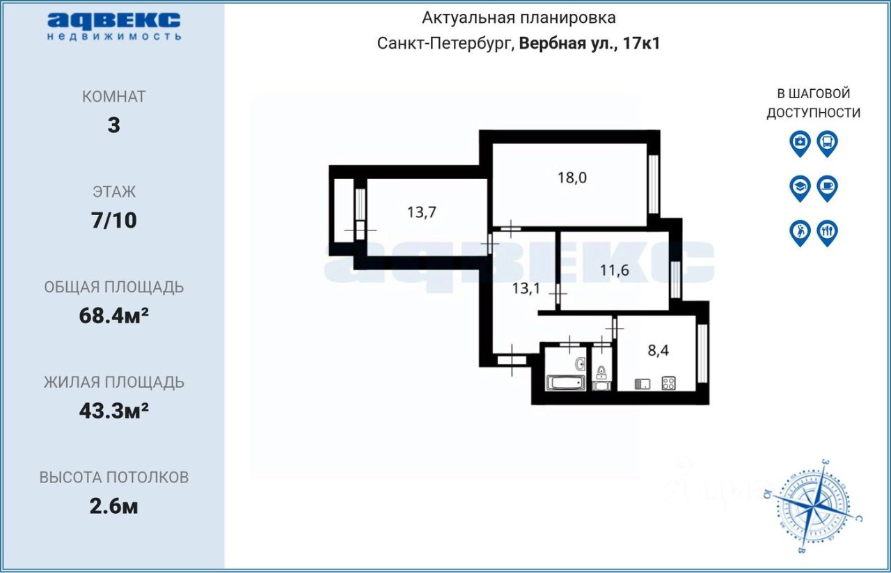 В прямой продаже трёхкомнатная просторная светлая двусторонняя квартира в хорошем доме ул. Вербная, д. 17к1 в престижном микрорайоне Коломяги Приморского района Санкт-Петербурга.
