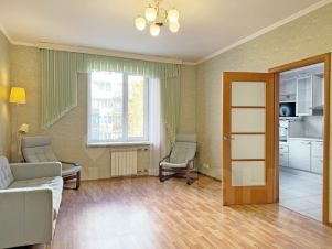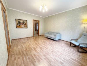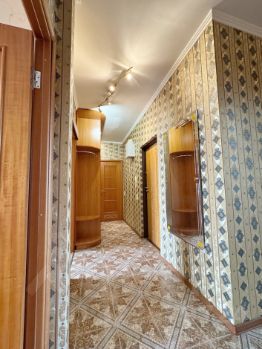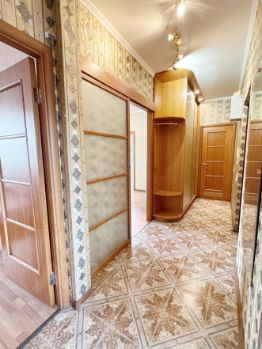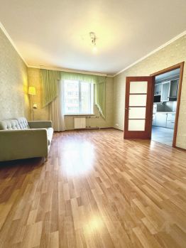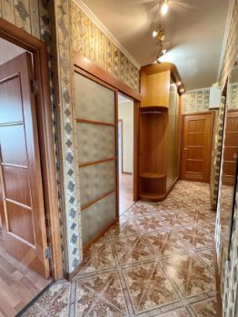 Общая площадь - 86,6 м2, плюс 3м2 остекленный балкон. В квартире три просторных комнаты правильной прямоугольной формы (15.8м2, 18.7м2 и 23.5м2), выходят на обе стороны дома. В прихожей установлен вместительный шкаф-купе до потолка с наполнением (остается новым хозяевам).