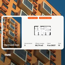 Продаётся 3-комн. квартира площадью 68,74 кв.м на 11 этаже 24 этажного дома (Корпус 5, Секция 2) проекта ПИК Заречный парк. Светлый просторный подъезд на уровне земли, функциональная планировка, большие окна, c отделкой.