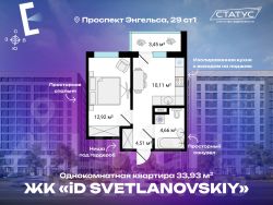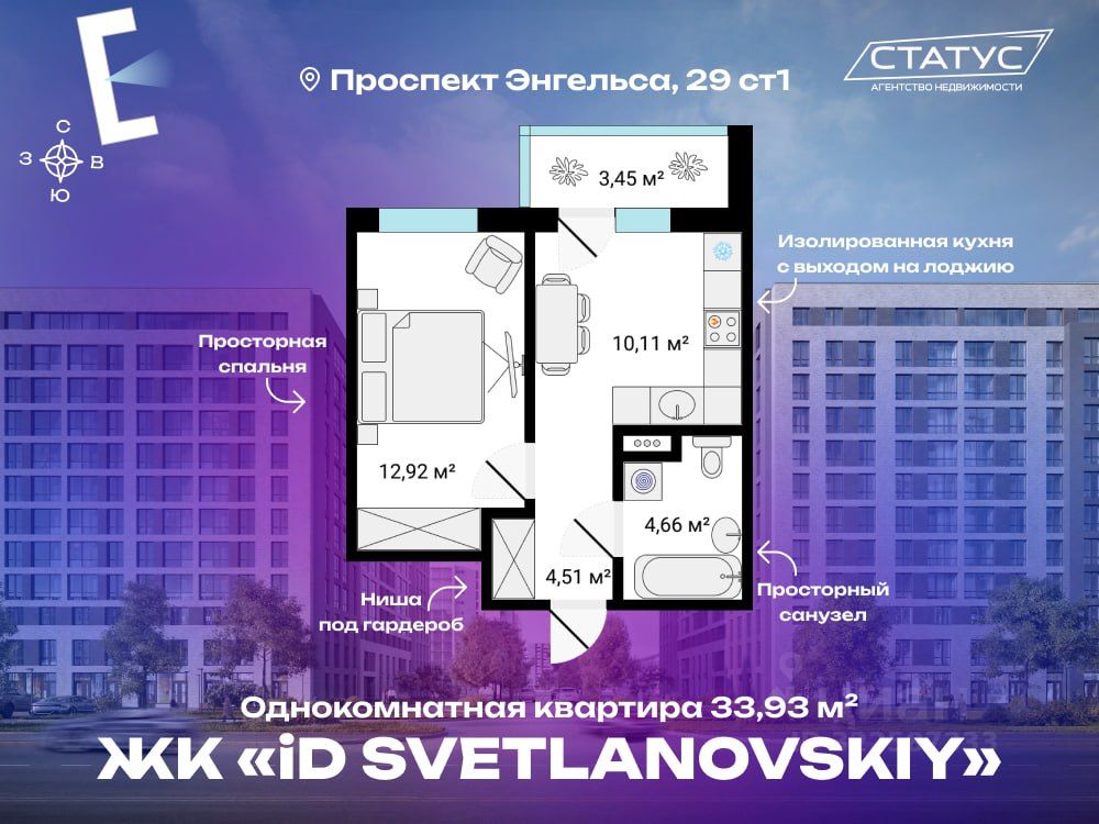 Однокомнатная квартира 33,93 м² (+ лоджия 3,45 кв м) на 5 этаже во 2 корпусе, 3 секции — идеальный вариант для жизни или инвестиций. Просторная спальня 12,92 м², изолированная кухня 10,11 м² с выходом на лоджию 3,45 м² и вместительный санузел 4,66 м². Ниша под гардероб и удобная прихожая делают квартиру максимально функциональной.