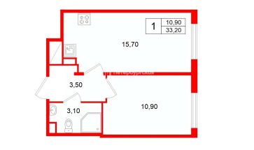 Квартира расположена на 7-м этаже, общая площадь квартиры 33.2 м2, жилая площадь 10,9 м2, кухня 15,7 м2.