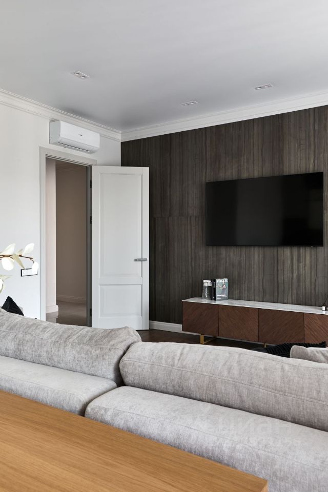 Квартира имеет функциональную планировку: просторная кухня-гостиная, 2 спальни, вместительные гардеробные и другие системы хранения.