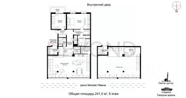 Светлая видовая квартира площадью 241 кв. м с видом на акваторию Малой Невки и парки Крестовского острова. Из панорамных окон кухни-гостиной площадью 84 кв. м открывается вид на "Газпром Арену", башню "Лахта Центра" и закаты. Высокие потолки 4,8 м наполняют квартиру солнечным светом. Окна спален выходят в тихий благоустроенный двор.