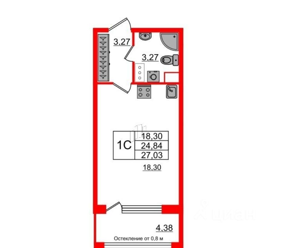 * Площадь: 27,03 м², жилая 18,3 м², потолки 3 м много воздуха и пространства!