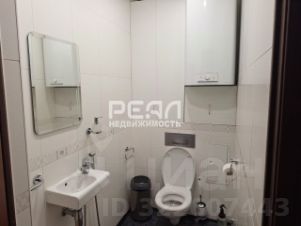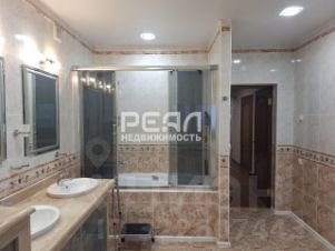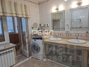 Ванная комната со столешницей из камня и двумя раковинами имеет выход на лоджию.