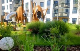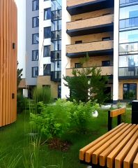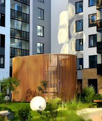 Закрытый двор без машин с ландшафтным озеленением, дендрариумом, редкими растениями, цветами и кустарниками, с променадом, с красивой вечерней подсветкой, с современными безопасными детскими игровыми зонами, с местами для отдыха, скамеечками-качелями, и многочисленными парковками для велосипедов. Круглосуточная система видеонаблюдения, дежурная охрана, система контроля доступа в парадные.