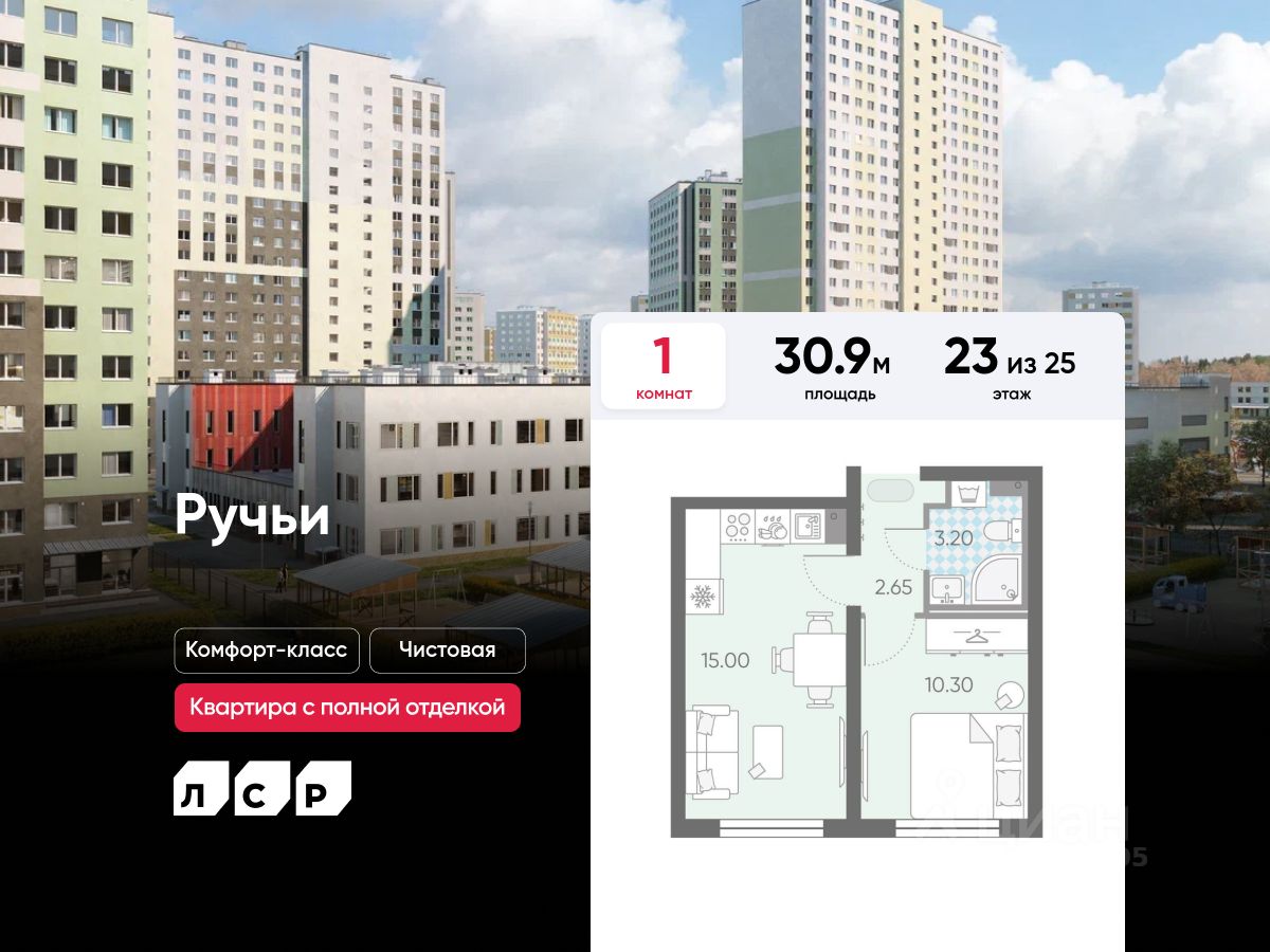 Продаётся 1-комнатная квартира в ЖК "Ручьи" на 23 этаже. Общая площадь составляет 30.90 кв. м. Квартира с чистовой отделкой. Жилой комплекс "Ручьи" располагается по адресу Санкт-Петербург, Красногвардейский.