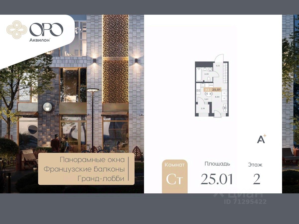 Просторная однокомнатная квартира-студия с отделкой в ЖК "ORO by Akvilon" на 2 этаже. Общая площадь: 25.01 кв.м., площадь гостиной 14.41 кв.м., из которых 5.61 кв.м. выделено под кухонную зону. Все окна выходят на одну сторону. В квартире одна лоджия, один совмещенный санузел. Высота потолков 2.85 м.