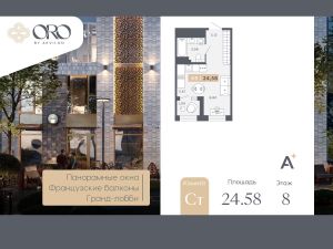 1-комн. квартира-студия с отделкой в ЖК "ORO by Akvilon" на 8 этаже. Общая площадь: 24.58 кв.м., площадь гостиной 14.41 кв.м., из которых 5.61 кв.м. выделено под кухонную зону. Все окна выходят на одну сторону. В квартире одна лоджия, один совмещенный санузел. Высота потолков 2.85 м.