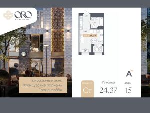 Продается 1-комн. квартира-студия с отделкой в ЖК "ORO by Akvilon" на 15 этаже. Общая площадь: 24.37 кв.м., площадь гостиной 14.41 кв.м., из которых 5.61 кв.м. выделено под кухонную зону. Все окна выходят на одну сторону. В квартире одна лоджия, один совмещенный санузел. Высота потолков 2.85 м.