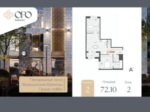 Двухкомнатная квартира с отделкой в ЖК "ORO by Akvilon" на 2 этаже. Общая площадь: 72.1 кв.м., жилая: 27.67 кв.м., площадь просторной кухни-столовой: 25.63 кв.м. Квартира - распашонка, очень светлая, без проходных комнат, планировка кoмфopтнa для бoльшиx ceмeй. В квартире одна лоджия, два совмещенных санузла. Высота потолков 2.85 м.