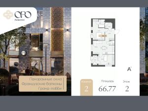 Просторная двухкомнатная квартира с отделкой в ЖК "ORO by Akvilon" на 2 этаже. Общая площадь: 66.77 кв.м., жилая: 27.8 кв.м., площадь просторной кухни-столовой: 20.4 кв.м. Угловая квартира, идеально подойдет любителям тишины и панорамных видов. В квартире одна лоджия, два совмещенных санузла. Высота потолков 2.85 м.