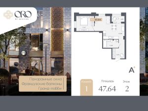 1-комн. квартира с отделкой в ЖК "ORO by Akvilon" на 2 этаже. Общая площадь: 47.64 кв.м., жилая: 11.47 кв.м., площадь просторной кухни-столовой: 21.86 кв.м. Квартира угловая, очень светлая, естественная вентиляция при открытии окон. В квартире одна лоджия, один совмещенный санузел. Высота потолков 2.85 м.
