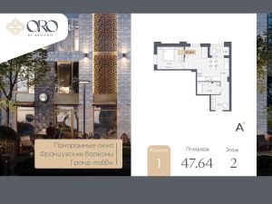 Просторная 1-комн. квартира с отделкой в ЖК "ORO by Akvilon" на 2 этаже. Общая площадь: 47.64 кв.м., жилая: 11.47 кв.м., площадь просторной кухни-столовой: 21.86 кв.м. Квартира угловая, очень светлая, естественная вентиляция при открытии окон. В квартире одна лоджия, один совмещенный санузел. Высота потолков 2.85 м.