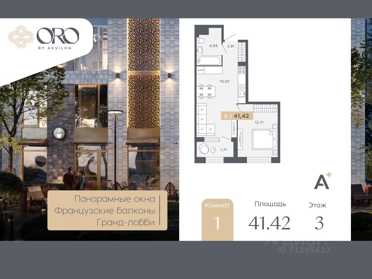 Продается 1-комн. квартира от застройщика с отделкой в ЖК "ORO by Akvilon" на 3 этаже. Общая площадь: 41.42 кв.м., жилая: 12.71 кв.м., площадь просторной кухни-столовой: 19.2 кв.м. Все окна выходят на одну сторону. В квартире одна лоджия, один совмещенный санузел. Высота потолков 2.85 м.