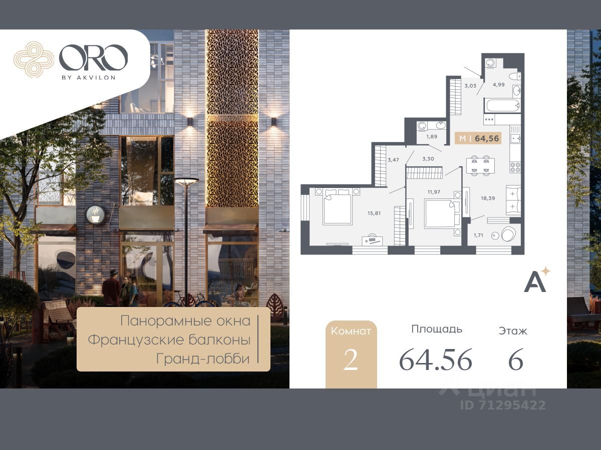 Двухкомнатная квартира от застройщика с отделкой в ЖК "ORO by Akvilon" на 6 этаже. Общая площадь: 64.56 кв.м., жилая: 27.78 кв.м., площадь просторной кухни-столовой: 18.39 кв.м. Угловая квартира, очень светлая, естественная вентиляция при открытии окон. В квартире одна лоджия, один совмещенный санузел. Высота потолков 2.85 м.