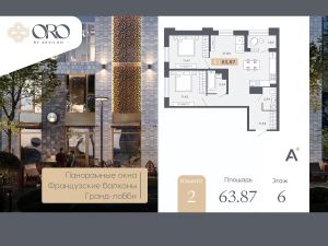 2-комн. квартира с отделкой в ЖК "ORO by Akvilon" на 6 этаже. Общая площадь: 63.87 кв.м., жилая: 22.89 кв.м., площадь просторной кухни-столовой: 21.8 кв.м. Квартира угловая, идеально подойдет любителям тишины и панорамных видов. В квартире одна лоджия, один раздельный санузел. Высота потолков 2.85 м.