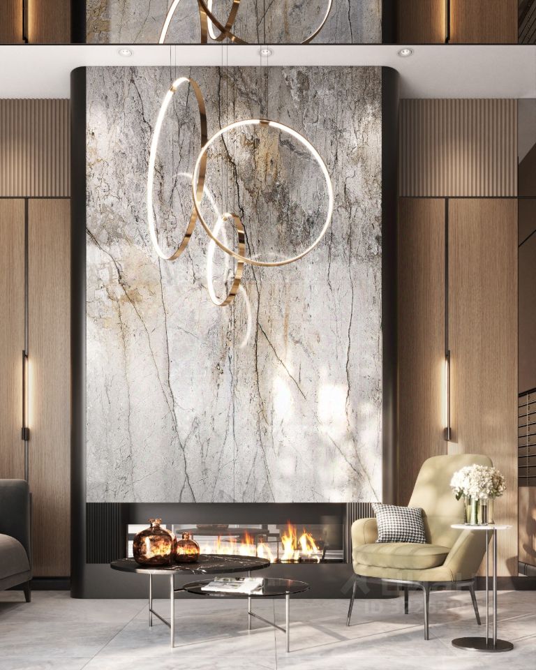 -Дизайнерская отделка гранд-лобби с биокамином и золотыми элементами