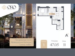 Просторная 1-комн. квартира с отделкой в ЖК "ORO by Akvilon" на 11 этаже. Общая площадь: 47.05 кв.м., жилая: 11.47 кв.м., площадь просторной кухни-столовой: 21.86 кв.м. Квартира угловая, очень светлая, естественная вентиляция при открытии окон. В квартире одна лоджия, один совмещенный санузел. Высота потолков 2.85 м.