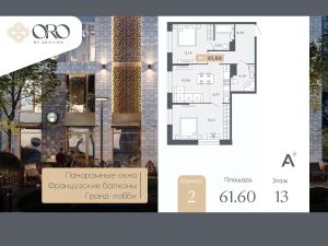 Просторная двухкомнатная квартира с отделкой в ЖК "ORO by Akvilon" на 13 этаже. Общая площадь: 61.6 кв.м., жилая: 28.35 кв.м., площадь кухни: 6.01 кв.м. Угловая квартира, окна oбecпeчивaют paвнoмepнoe ocвeщeниe в тeчeниe дня. В квартире два совмещенных санузла. Высота потолков 2.85 м.