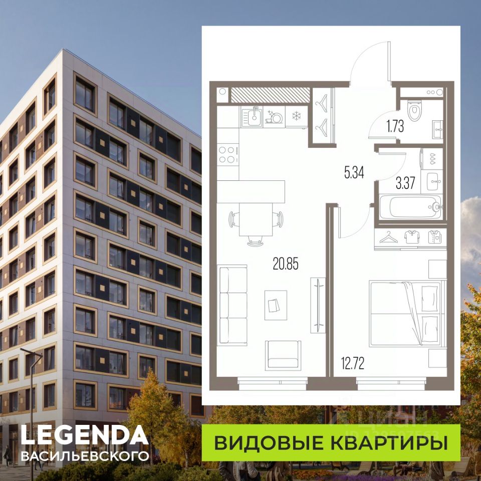 Однокомнатная квартира с предчистовой отделкой в ЖК "LEGENDA Васильевского" на 7 этаже. Общая площадь: 44.01 кв.м., жилая: 12.72 кв.м., площадь просторной кухни-столовой: 20.85 кв.м. Все окна выходят на одну сторону. В квартире один раздельный санузел. Высота потолков 2.7 м.