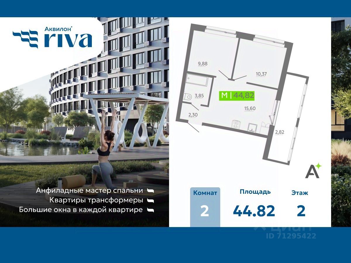 2-комн. квартира с отделкой в ЖК "Аквилон RIVA" на 2 этаже. Общая площадь: 44.82 кв.м., площадь просторной кухни-столовой: 15.6 кв.м. Высота потолков 2.73 м.
