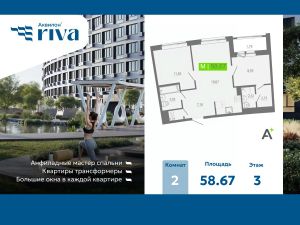 2-комн. квартира с отделкой в ЖК "Аквилон RIVA" на 3 этаже. Общая площадь: 58.67 кв.м., площадь просторной кухни-столовой: 19.07 кв.м. Высота потолков 2.73 м.