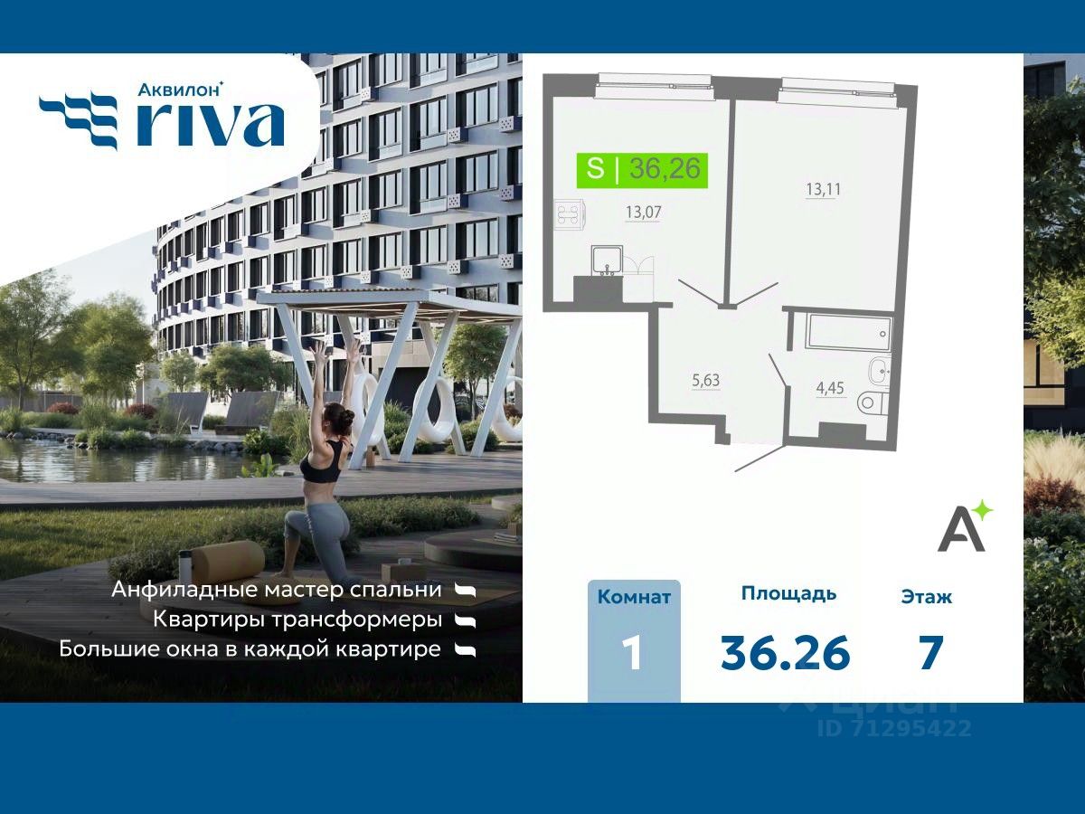 1-комн. квартира от застройщика с отделкой в ЖК "Аквилон RIVA" на 7 этаже. Общая площадь: 36.26 кв.м., площадь просторной кухни-столовой: 13.07 кв.м. Высота потолков 2.73 м.