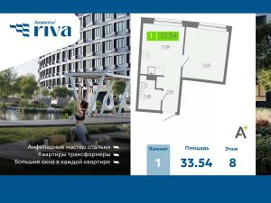 1-комн. квартира с отделкой в ЖК "Аквилон RIVA" на 8 этаже. Общая площадь: 33.54 кв.м., площадь просторной кухни-столовой: 12.67 кв.м. Высота потолков 2.73 м.