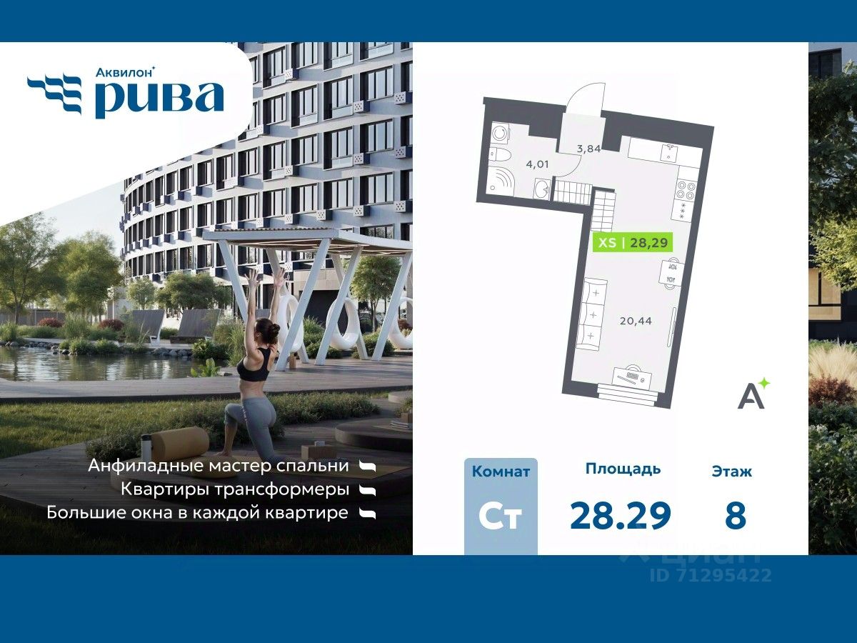 Продается 1-комн. квартира-студия от застройщика с предчистовой отделкой в ЖК "Аквилон Рива" на 8 этаже. Общая площадь: 28.29 кв.м., площадь гостиной 20.44 кв.м., из которых 5 кв.м. выделено под кухонную зону. Все окна выходят на одну сторону. В квартире один совмещенный санузел. Высота потолков 2.73 м.