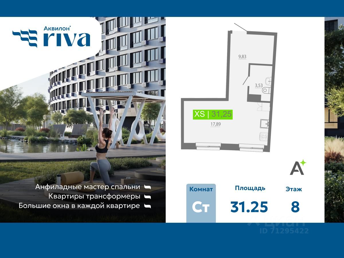Однокомнатная квартира-студия с отделкой в ЖК "Аквилон RIVA" на 8 этаже. Общая площадь: 31.25 кв.м., площадь гостиной 17.89 кв.м., из которых 5 кв.м. выделено под кухонную зону. Все окна выходят на одну сторону. В квартире один совмещенный санузел. Высота потолков 2.73 м.