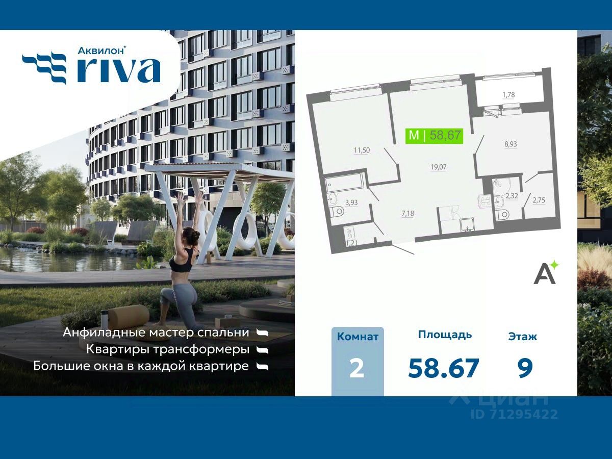 Двухкомнатная квартира с отделкой в ЖК "Аквилон RIVA" на 9 этаже. Общая площадь: 58.67 кв.м., площадь просторной кухни-столовой: 19.07 кв.м. Высота потолков 2.73 м.