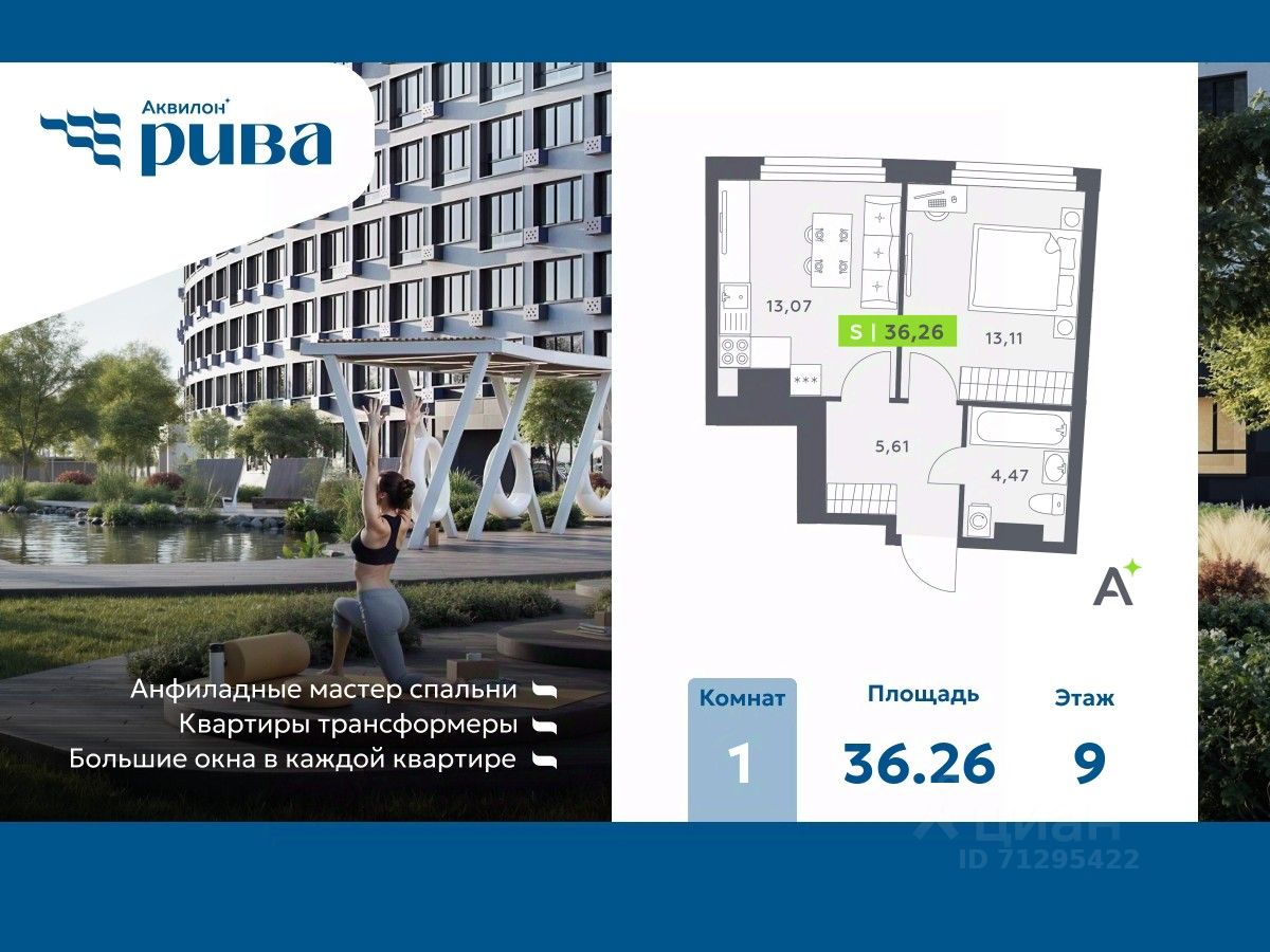 1-комн. квартира с предчистовой отделкой в ЖК "Аквилон Рива" на 9 этаже. Общая площадь: 36.26 кв.м., площадь просторной кухни-столовой: 13.07 кв.м. Высота потолков 2.73 м.
