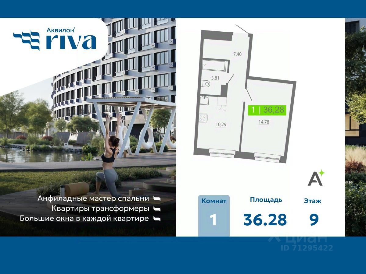 Просторная 1-комн. квартира с отделкой в ЖК "Аквилон RIVA" на 9 этаже. Общая площадь: 36.28 кв.м., площадь просторной кухни-столовой: 10.29 кв.м. Высота потолков 2.73 м.