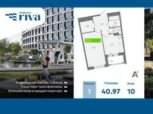 Продается 1-комн. квартира с отделкой в ЖК "Аквилон RIVA" на 10 этаже. Общая площадь: 40.97 кв.м., площадь просторной кухни-столовой: 9.1 кв.м. Высота потолков 2.73 м.