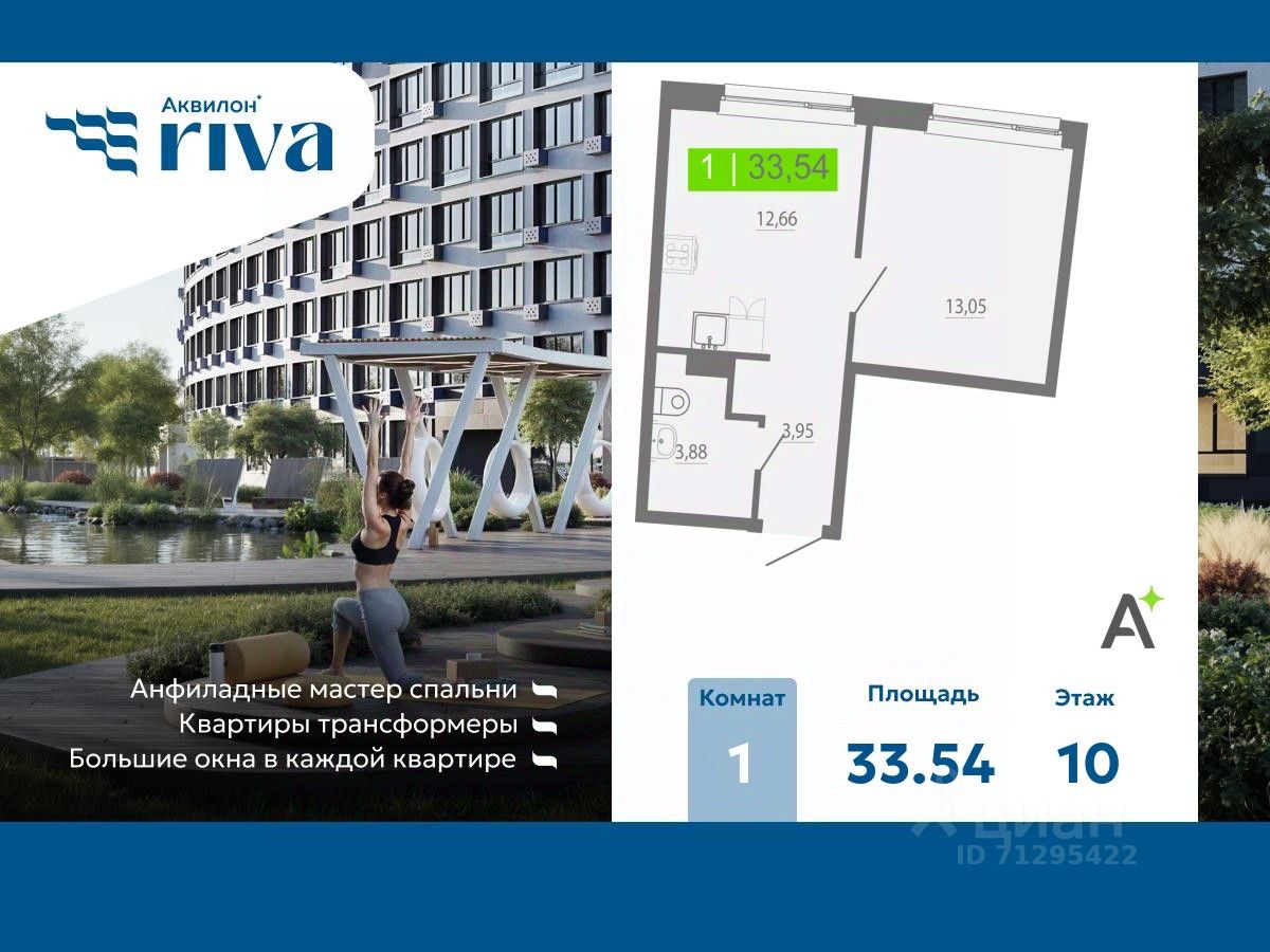 Продается 1-комн. квартира от застройщика с отделкой в ЖК "Аквилон RIVA" на 10 этаже. Общая площадь: 33.54 кв.м., площадь просторной кухни-столовой: 12.67 кв.м. Высота потолков 2.73 м.