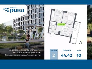Продается двухкомнатная квартира от застройщика с предчистовой отделкой в ЖК "Аквилон Рива" на 10 этаже. Общая площадь: 44.42 кв.м., площадь просторной кухни-столовой: 15.12 кв.м. Высота потолков 2.73 м.